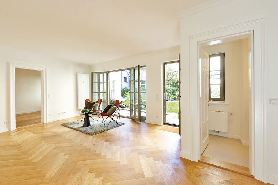 Dreischicht-Eichenparkett in Fischgrätverlegeart mit umlaufendem Randfries und weißen Profilsockelleisten auf nivellierten Bestandsböden