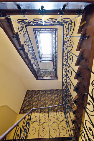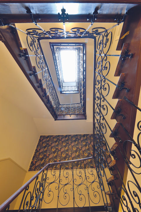 Besonderes Highlight ist das stilvolle Treppenhaus mit der schönen historischen Glaskuppel, das im Zuge der Sanierung mit ausgewählten floralen Tapeten, abgesetzten Wandfarben und Glasleuchten der Manufaktur „Berliner Messingleuchten“ ausgestattet wurde.