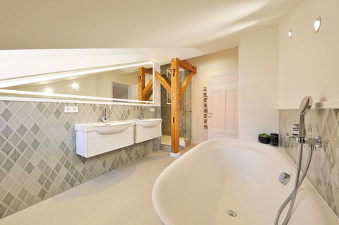 Großzügige hochwertig ausgestattete Bäder mit Badkeramik von Laufen und Armaturen von Dornbracht und Carlo Fratini, Fliesen in dem für die Neurenaissance typischen Rautendekor von Carmen Ceramica, beleuchtete Spiegel und Regenduschen.