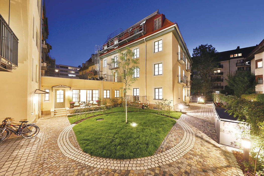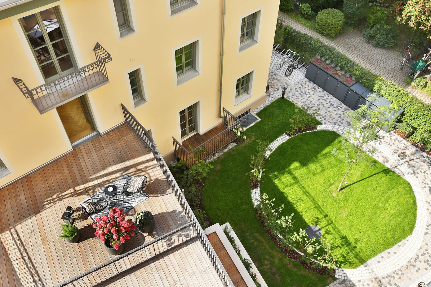 Über eine eigene abgeschlossene Hofeinfahrt gelangen Sie in den Hofgarten, der vom Landschaftsarchitekten neu gestaltet wurde. Keine Autostellplätze mehr im Hof, stattdessen viel Fahrradabstellraum. Kein Asphalt mehr, sondern Wege in Naturstein im Herbstlaubmuster.